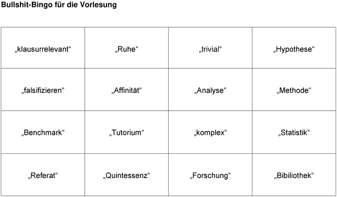 In der heutigen schnelllebigen Zeit ist es oft eine Herausforderung, den Überblick zu behalten, besonders wenn es um Vorlesungen und akademische Veranstaltungen geht. Die Vorlage zum Bullshit-Bingo für die Vorlesung bietet eine unterhaltsame und interaktive Möglichkeit, sich während der Vorlesungen zu engagieren. Sie verwandelt trockene Stunden in lebendige Erlebnisse und sorgt dafür, dass du aktiv bleibst.